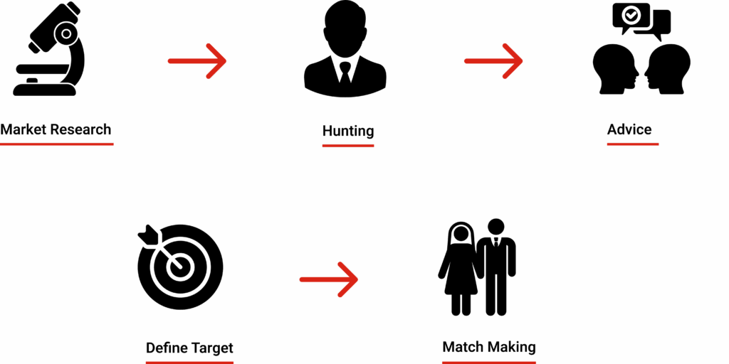 We identify relevant target organisations and determine the best research channels — combining databases, market intelligence and personal networks.